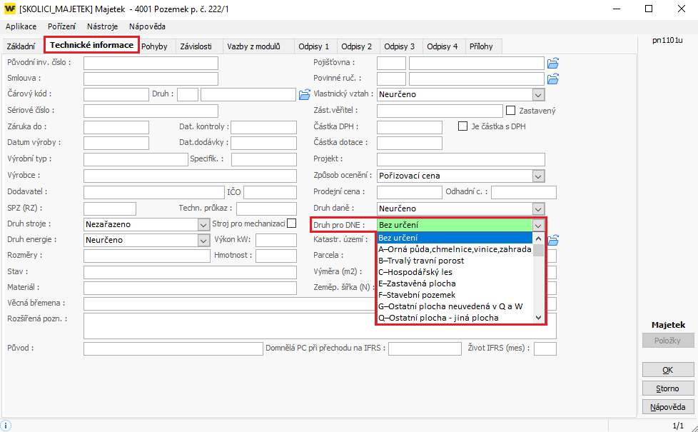 V modulu Majetek byl zaveden nový status, který lze využít právě pro účely DNE u evidovaných pozemků. V aplikaci *1198 Evidence majetku, na záložce Technické informace, je nyní dostupné pole Druh pro DNE – viz obrázek.