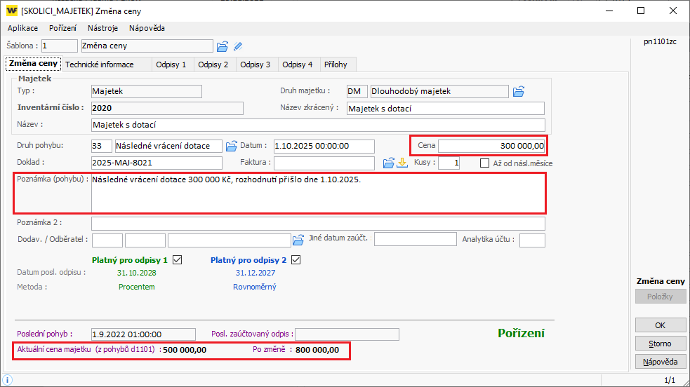 V září roku 2022 byl pořízen majetek v pořizovací ceně 800 000 Kč, přičemž výše přijaté dotace činila 300 000 Kč. Na základě této dotace bylo provedeno snížení pořizovací ceny majetku. Ze snížené částky 500 000 Kč byl majetek odepisován, a do září 2025 bylo celkem odepsáno 308 358 Kč. V říjnu téhož roku přišlo rozhodnutí o povinnosti vrátit dotaci.