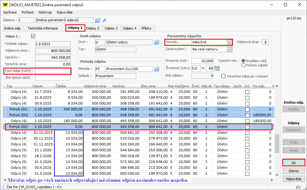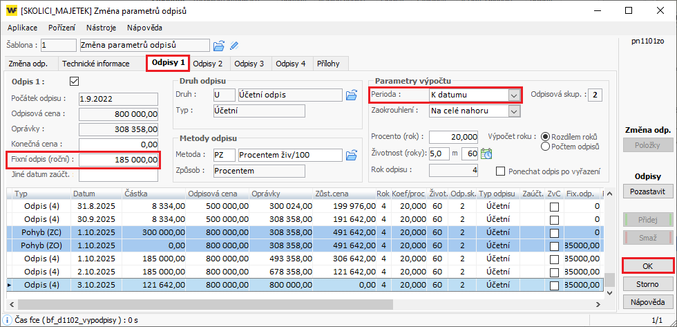 - Tlačítko Změna parametru odpisů – datum o den později (např. 2.10.2025).