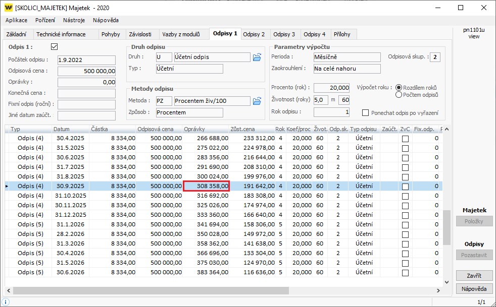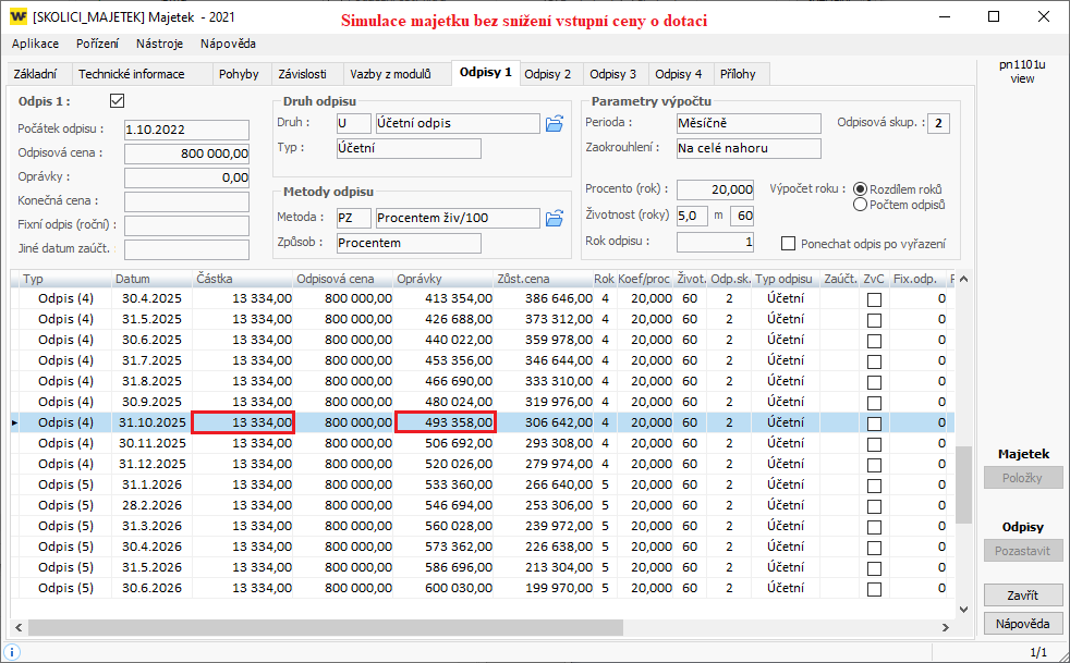 Po těchto krocích by měla být měsíční výše účetního odpisu stejná jako ta, kterou jste si nasimulovali v pomocném majetku.