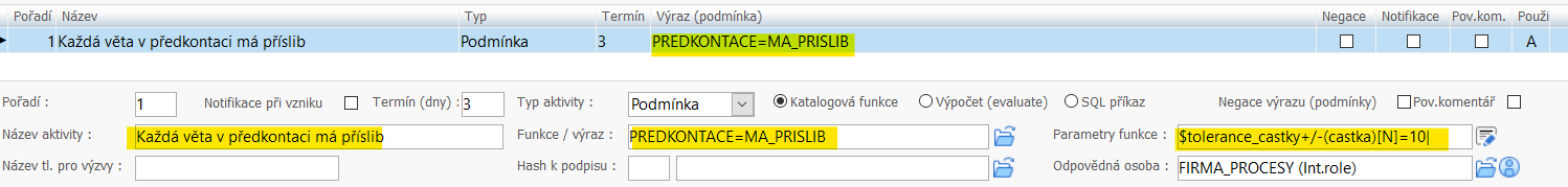U těchto podmínek lze zadat toleranci v případě, že nechceme řešit haléřové či korunové rozdíly oproti schválenému Příslibu. Toleranci je nutné nastavit v Parametrech funkce v Kč, vždy u obou podmínek. Zde je příklad tolerance 10 Kč oproti schválenému Příslibu.
