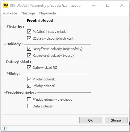 - Při prvotním převodu lze zrušit pouze parametr pro Datový sklad (ostatní volby jsou aktivní pouze při opakovaných převodech).