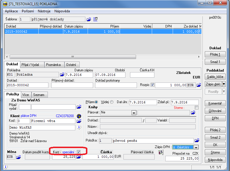 - Při zápisu se automaticky nabízí kurz ČNB, pokud je načten kurzový lístek.