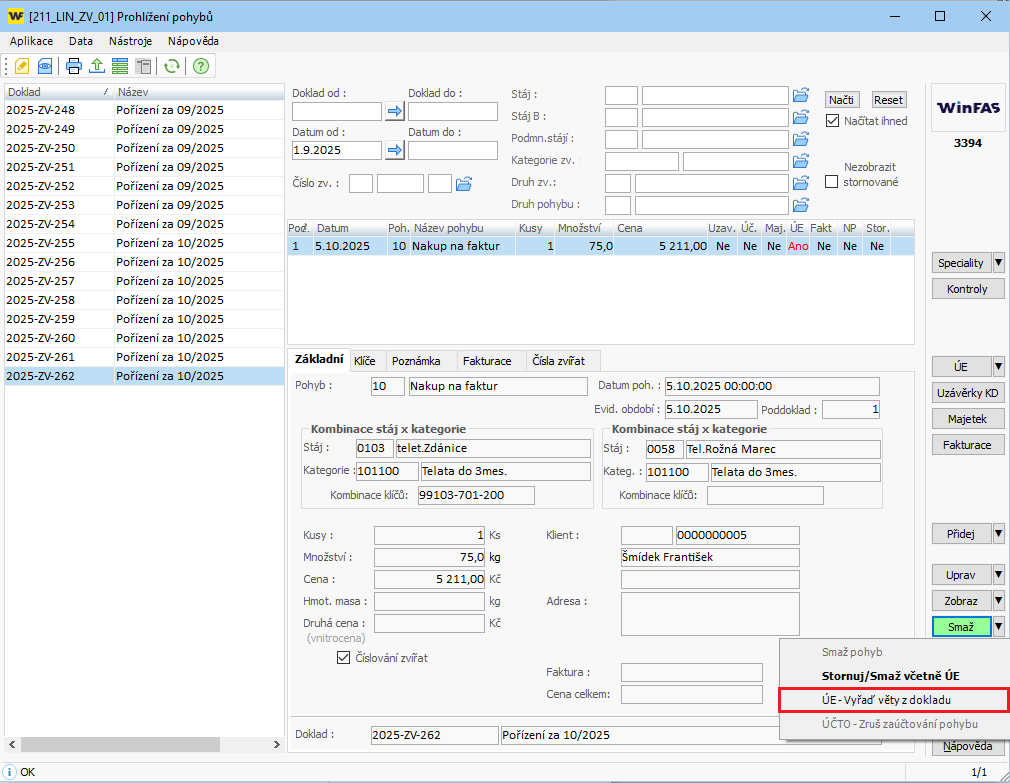 - Klikněte na výběr tlačítka "Smaž" a vyberete funkci „ÚE – vyřaď věty z dokladu“.