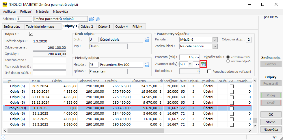 Životnost = 01 → Poslední odpis proběhne v následujícím období.