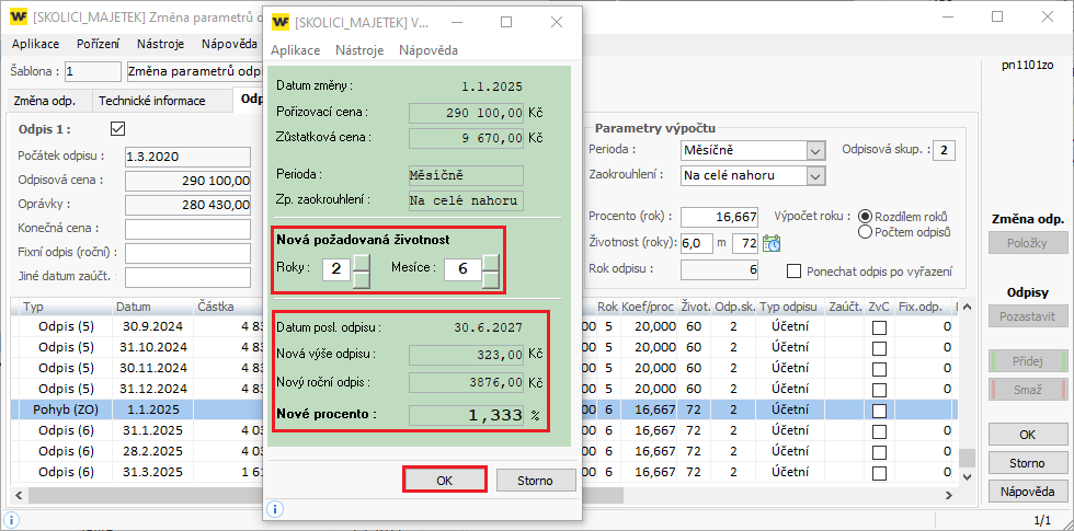 Kalkulačka převezme aktuální pořizovací a zůstatkovou cenu a po zadání požadované doby odepisování (nová životnost = počet roků/měsíců od data změny) vypočítá nové procento odpisu, které uloží do pořízení prodloužení životnosti u daného majetku. Datum posledního odpisu je maximální doba dopisu s ohledem na případná zaokrouhlení a výši zůstatkové ceny.