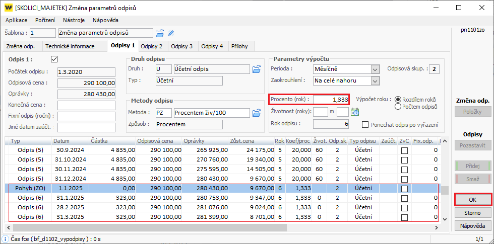 Po výběru položky stiskněte tlačítko „Zm. par.odp“ (změna parametrů odpisu) v pravé části okna. -
