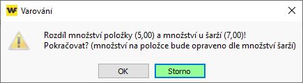 Pokud při opravě šaržě na dokladu zapíšete jiné množství na šarži, než má položka dokladu, systém Vám úpravu nedovolí uložit. Nemůže se množství lišit.