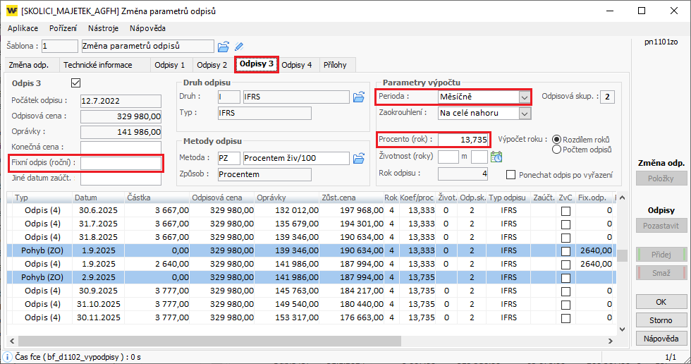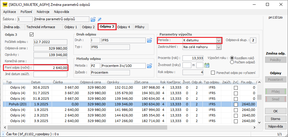 b) Zadejte fixní odpis pro IFRS okruh (Odpisy 3):
