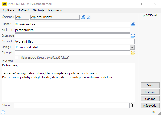 - Zvolte tlačítko Výplata a doplňte údaje pro odesílání výplatní listiny e-mailem: