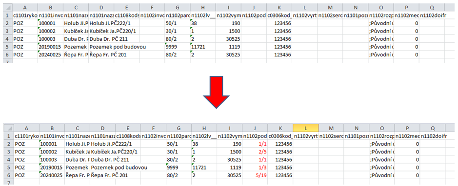 Vzor importovaných dat včetně hlavičky s kódy sloupců: