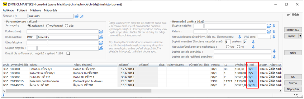 - Seznam načtených majetků lze tlačítkem "Export XLS" exportovat do souboru XLS, kde lze provádět další operace.