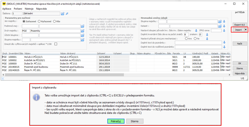 - Import nových hodnot z clipboardu pro načtené majetky - doplní pouze nové nebo upravené hodnoty k již načteným majetkům.