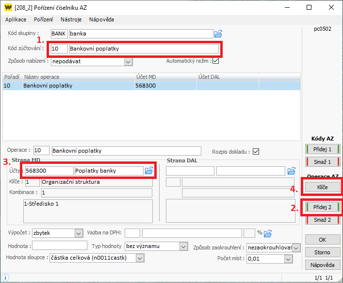 Číselník slouží k nastavení automatického zaúčtování v různých skupinách. Níže je uveden příklad nastavení automatického zaúčtování bankovních poplatků.