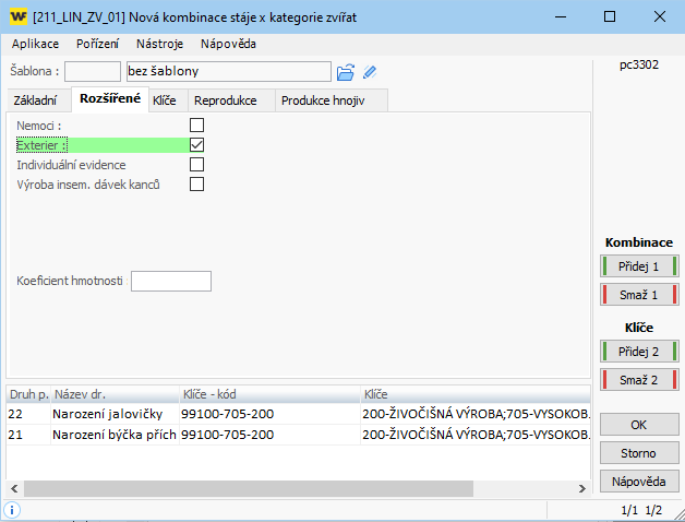 • 1. Otevřete aplikaci *3302 Číselník kombinací stáj x kategorie zv.