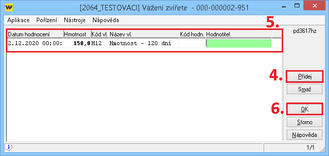 - 4. Pokud pořizujete druhé a další vážení vybraného zvířete klepněte na tlačítko „Přidej“.