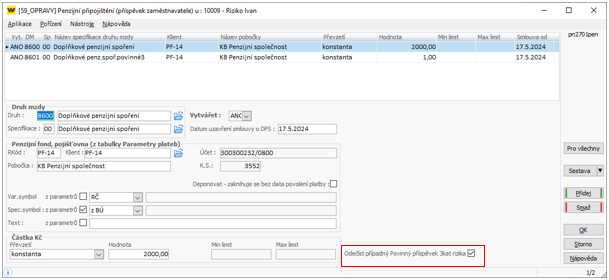 Pokud chcete, aby dobrovolný příspěvek v měsíci byl pouze doplatkem do nějaké pevné částky, kdy povinný příspěvek 4 % bude nižší, než Vámi požadovaná částka, v automatické větě dobrovolného příspěvku zaškrtnete Odečíst případný Povinný příspěvek 3kat rizika. Bude-li povinný příspěvek 4 % nižší, než uvedená částka, vytvoří se dobrovolný příspěvek v chybějící výši. Bude-li povinný příspěvek vyšší, dobrovolný příspěvek bude nula.