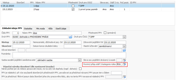 Pokud zaměstnanec v daném pracovněprávním vztahu (PPV) vykonává vybrané rizikové práce dle zákona, uveďte tuto skutečnost k jeho jednotlivým PPV v *7011. Klepnutím na ikonu u údaje se otevře pořízení, kde uvedete období, ve kterém zam-ec v tomto PPV vykonává uvedené rizikové práce včetně data, kdy nárok na příspěvek uplatnil. Pouze u PPV, kde je nárok v měsíci zpracování takto zadán, se bude zaměstnanci povinný příspěvek počítat.
