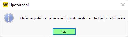 Pokud pořídíte fakturu z dodacího listu ze zásob, pak údaj pro kombinaci klíčů nelze přepsat ani na jednom z dokladů. Důvodem je udržení jednotnosti napříč oběma doklady. Zakázané údaje ze zásob najdete v návodu +3591.